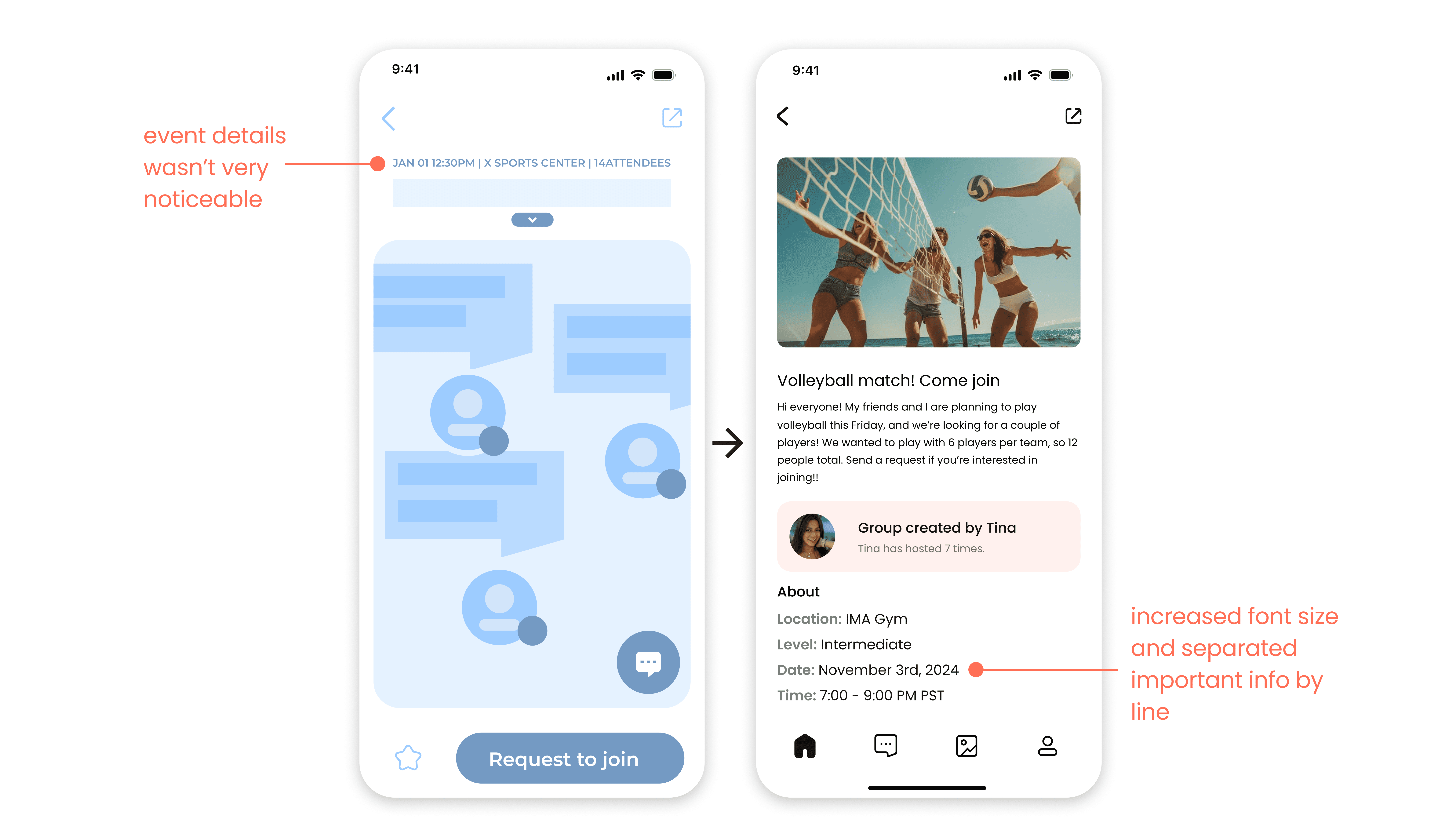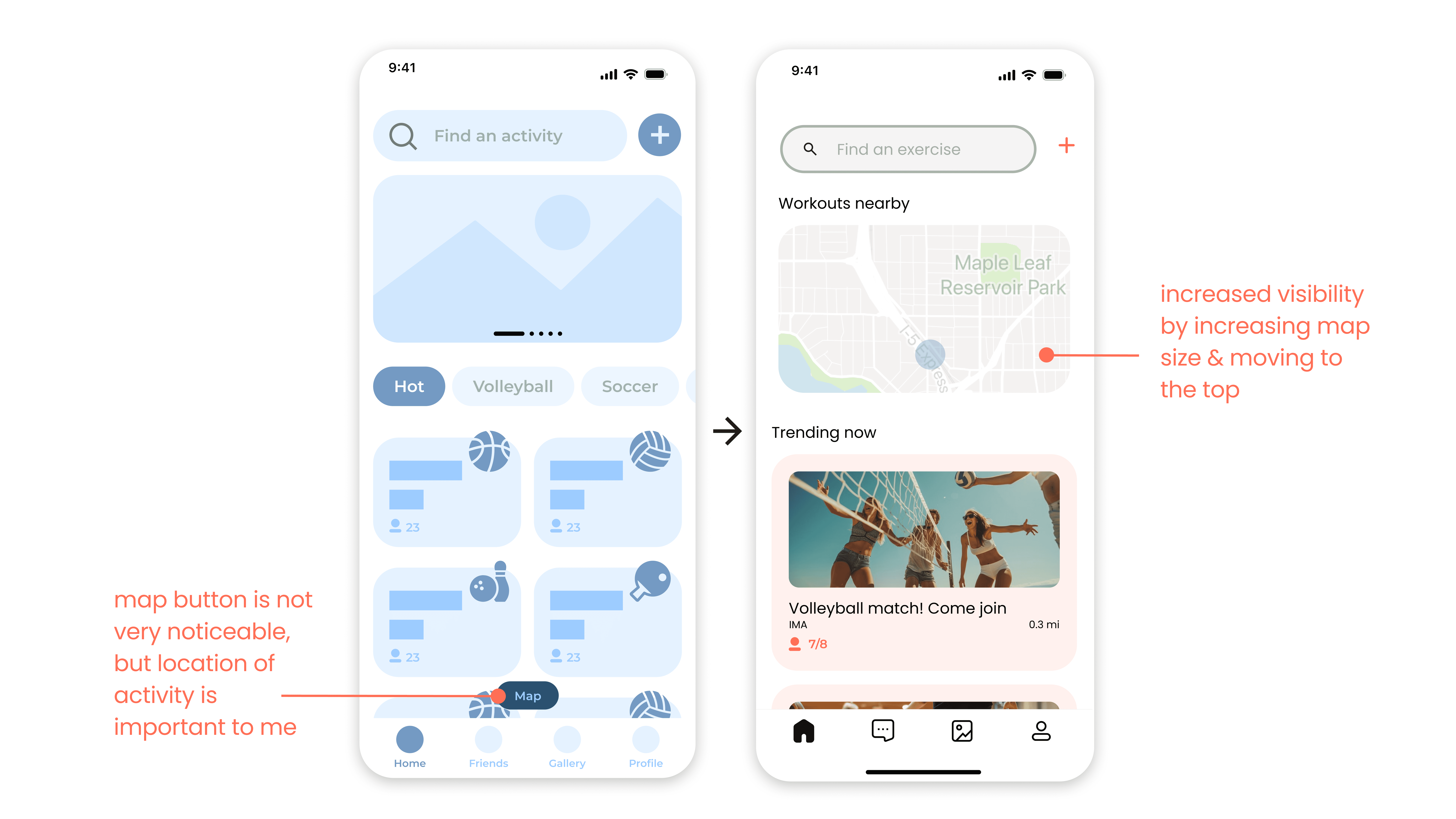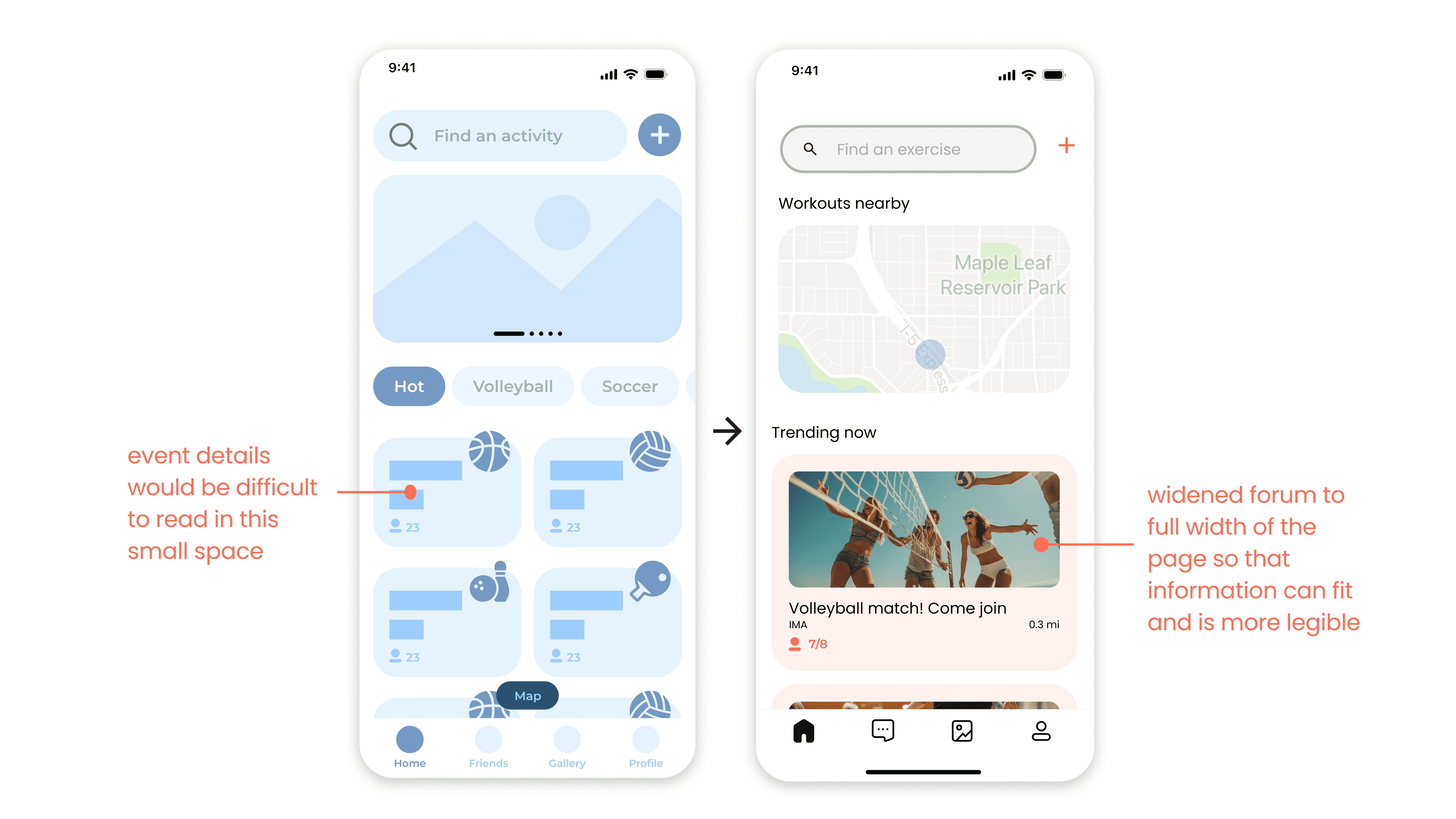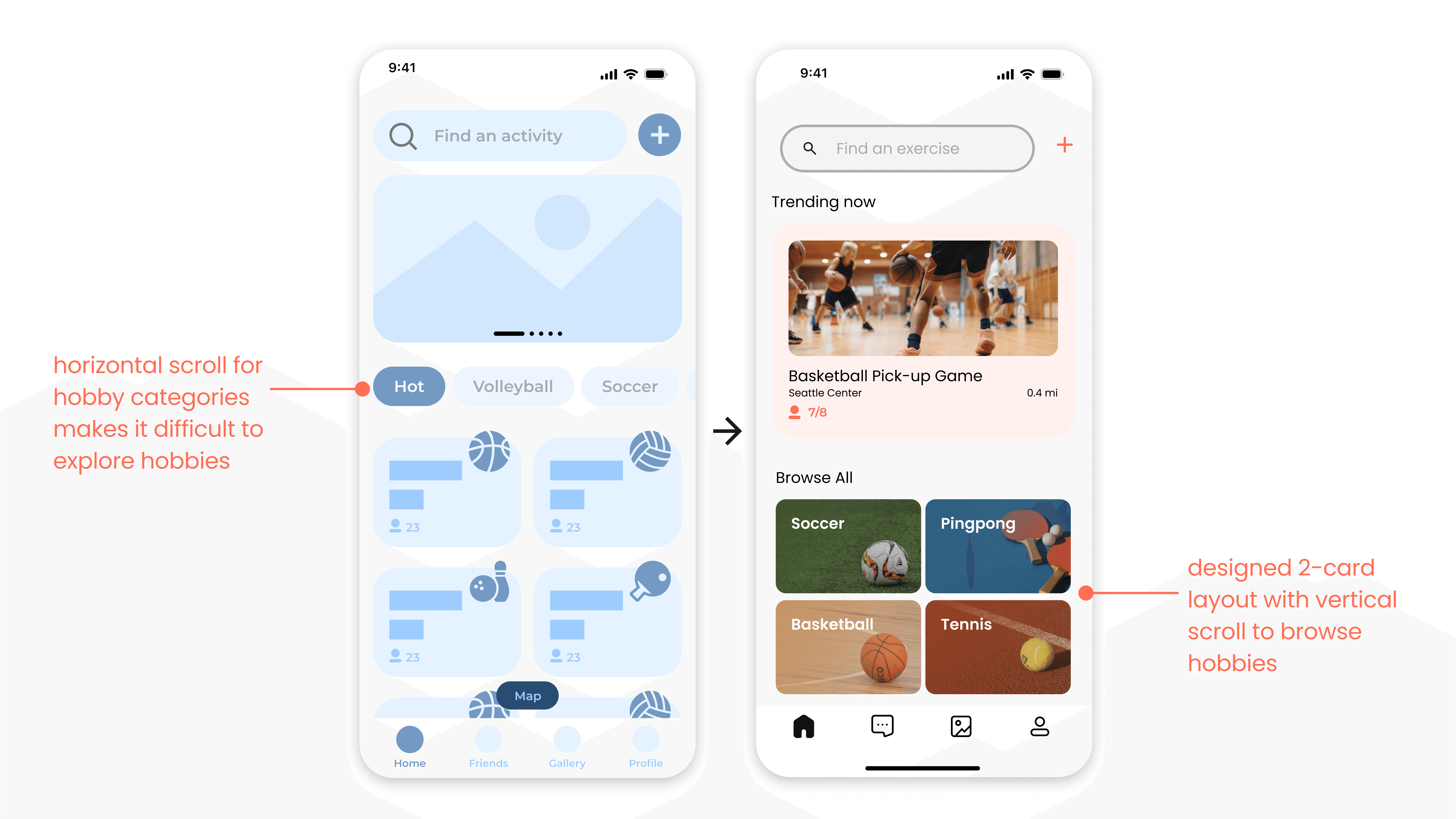 Through our user interviews, we found that a majority of user interviewees enjoyed physical activity, doing things like weight lifting, pickleball, or volleyball. Thus, we decided to design a focused hobby app to connect young remote workers.
